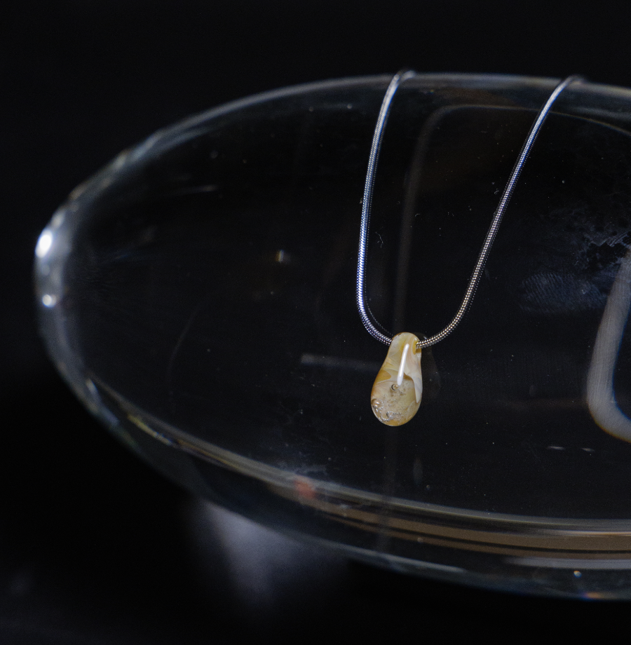 在製作時加入毛髮/骨灰使其隨著高溫與玻璃溶合而成形的